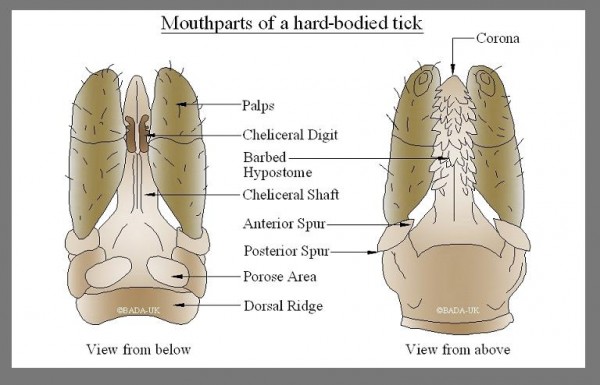 The mouth parts of all tick species comprise 2 palps (limbs with sensory organs), 2 chelicerae (cutting tools) and a hypostome, which is a barbed tube that anchors into the flesh of the host and allows blood to be drawn into the tick. The mouth parts can vary in size and shape depending on the species of tick although some of these differences are too microscopic to see with the naked eye.